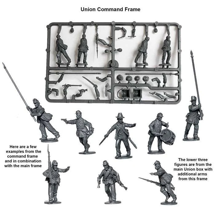 The figures in this box represent the bulk of the Union Infantry forces during the Civil War. The figures are in the four buttoned sack coats which was the most common type of coat worn by Federal troops during the war. The set also contains both forage caps and board-brimmed hats for all the figures.